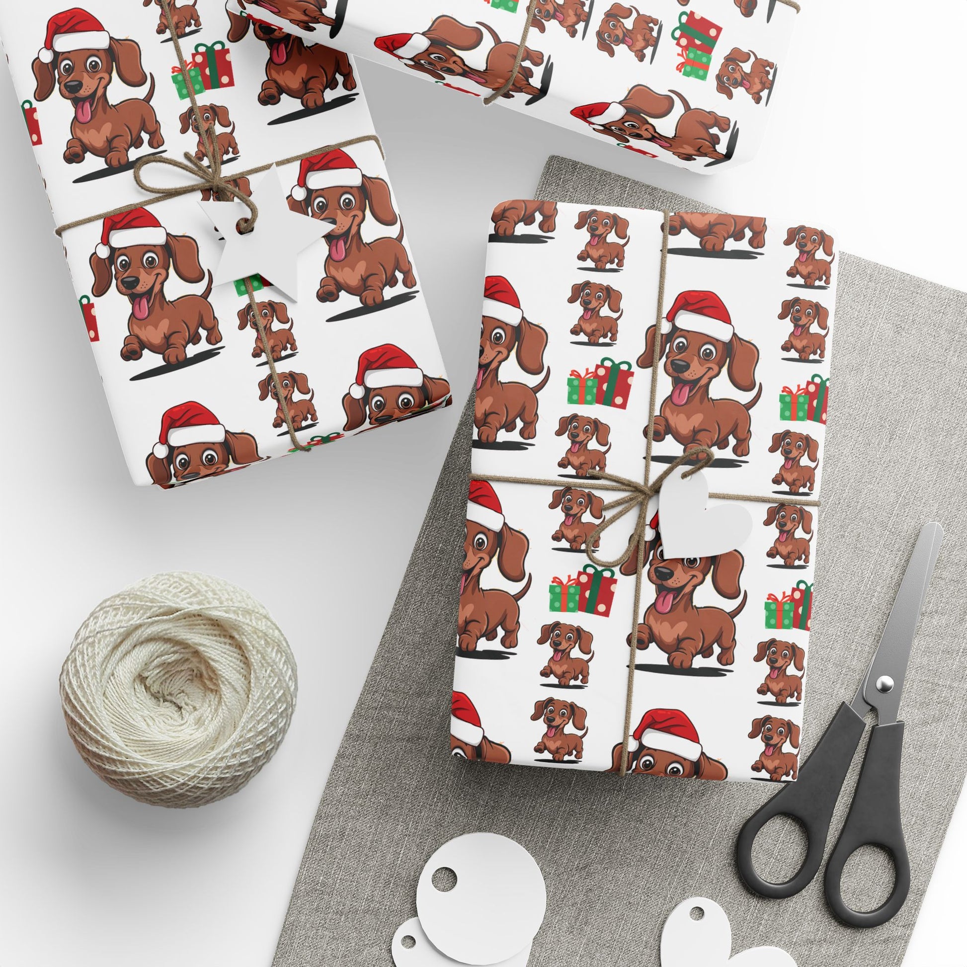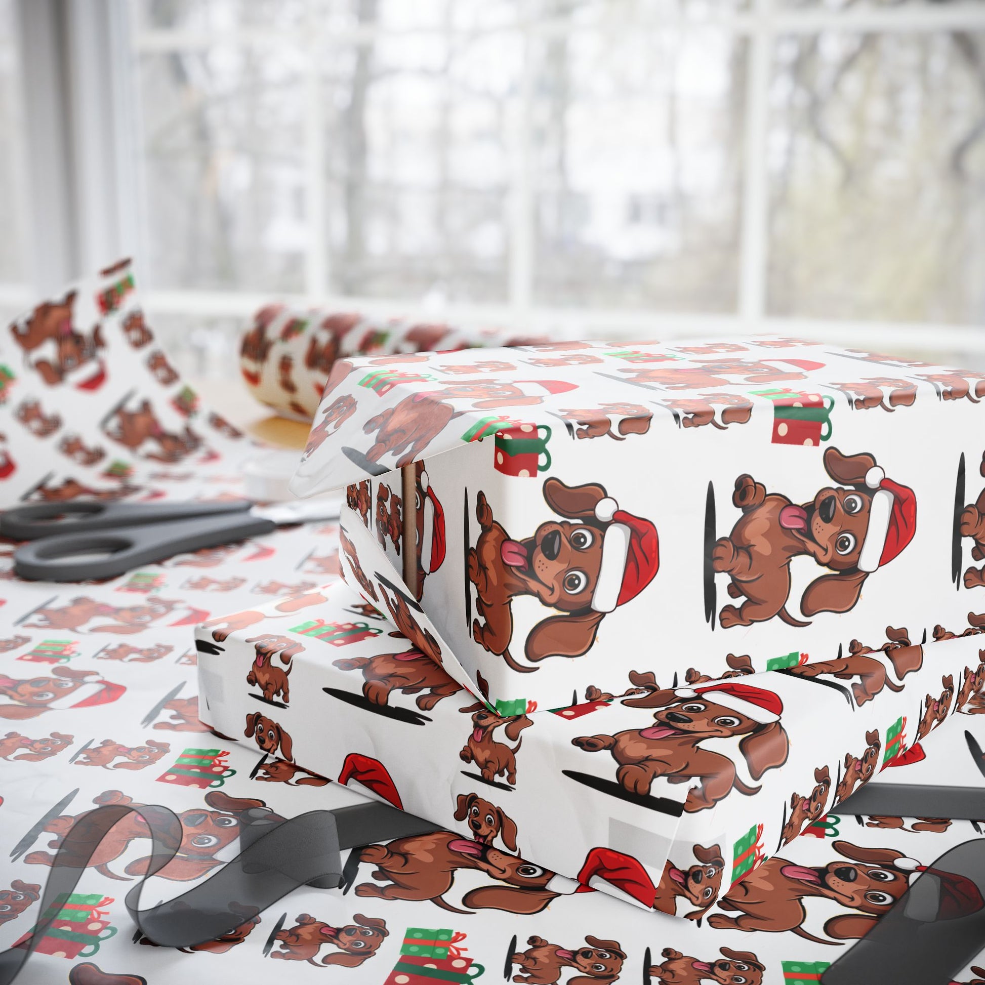 Scatter small dachshunds across the room and let wrapping take on a playful, cozy mood. This Christmas wrapping paper is patterned with long-bodied, curious dachshunds in festive poses—antlers, knit scarves, tiny Santa hats—set against a warm seasonal palette. Each sheet feels substantial yet smooth, so folds stay crisp and the illustrations keep their charm while you wrap stocking-sized surprises or longer gifts. It’s for people who love low-to-the-ground companions and holiday details: dog lovers who linger over ribbon choices, hosts who wrap with care before guests arrive, and anyone gifting to a dachshund owner the night before a family gathering. Use it to set a cheerful tone at yuletide dinners, under the tree at winter gatherings, or for thoughtful house visits where a wrapped present becomes part of the welcome. The design speaks to those who notice the small, silly things—the wag, the stretched pose, the way a pup commandeers the coziest corner—so the wrapping becomes part of the gift’s story.